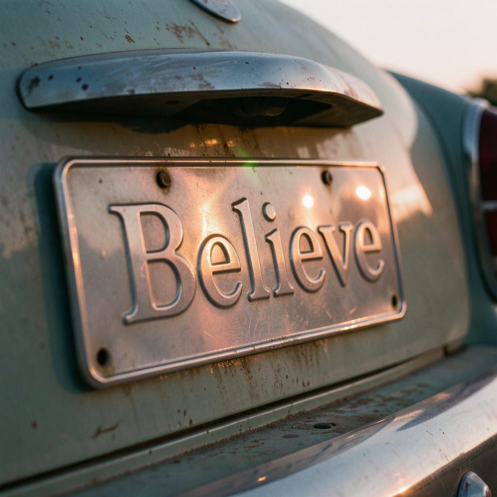 This photorealistic image captures a weathered vintage car's number plate displaying "Believe" in elegant font under a soft twilight. Shot with a vintage lens, it emphasizes texture and depth.
