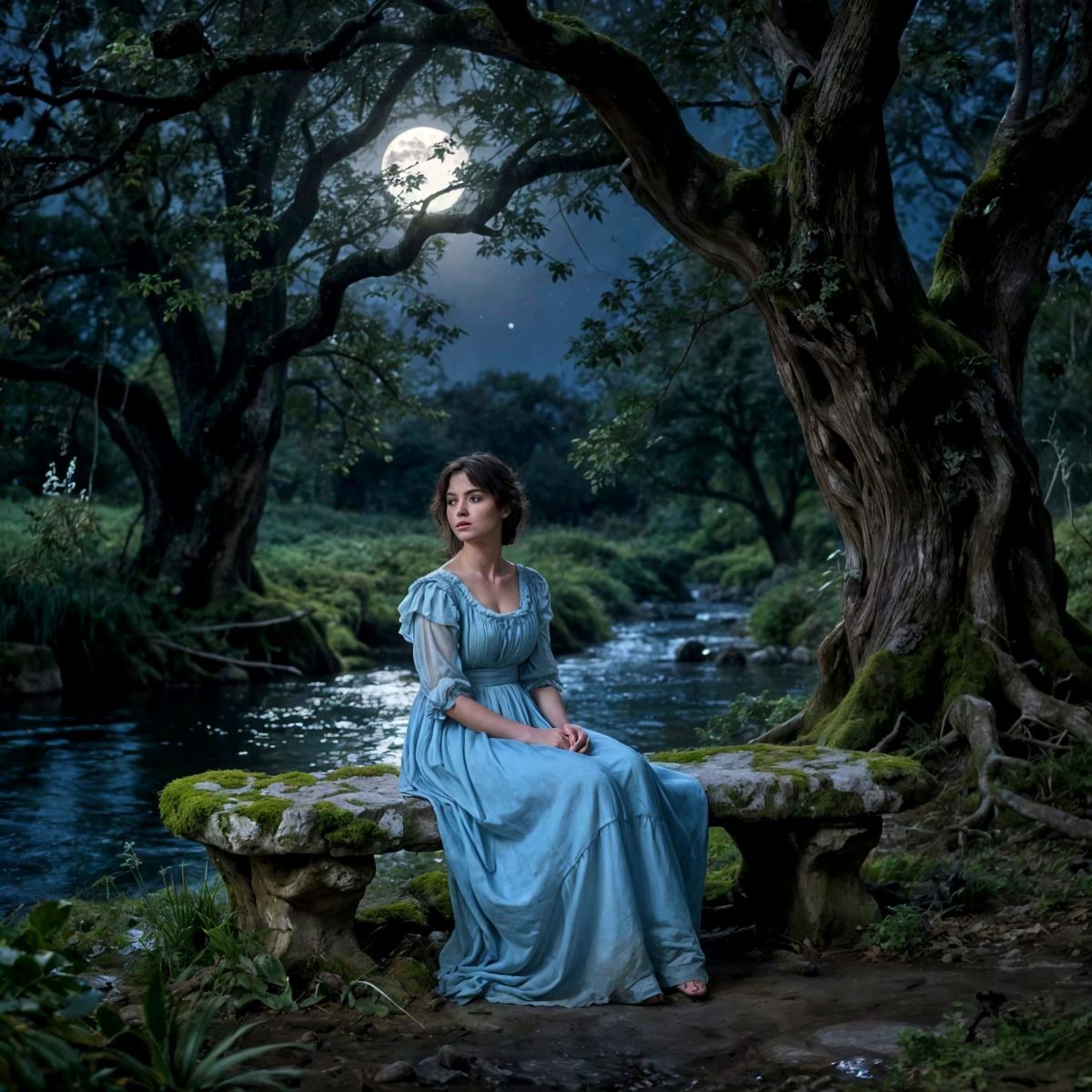 A solitary woman in a blue gown rests on a mossy bench under moonlit trees. A stream reflects the starry sky, evoking peace. Rendered with dramatic lighting and a painterly finish.