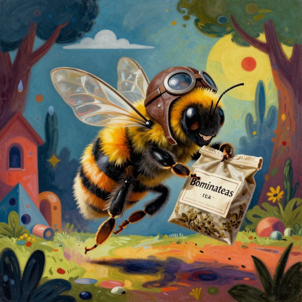 This highly detailed illustration shows a whimsical bumblebee in an aviator cap, clutching a pack of tea labeled "Bominateas". The background features a surreal landscape with bold colors and geometric shapes, inspired by the styles of Otto Dix and Paul Klee.