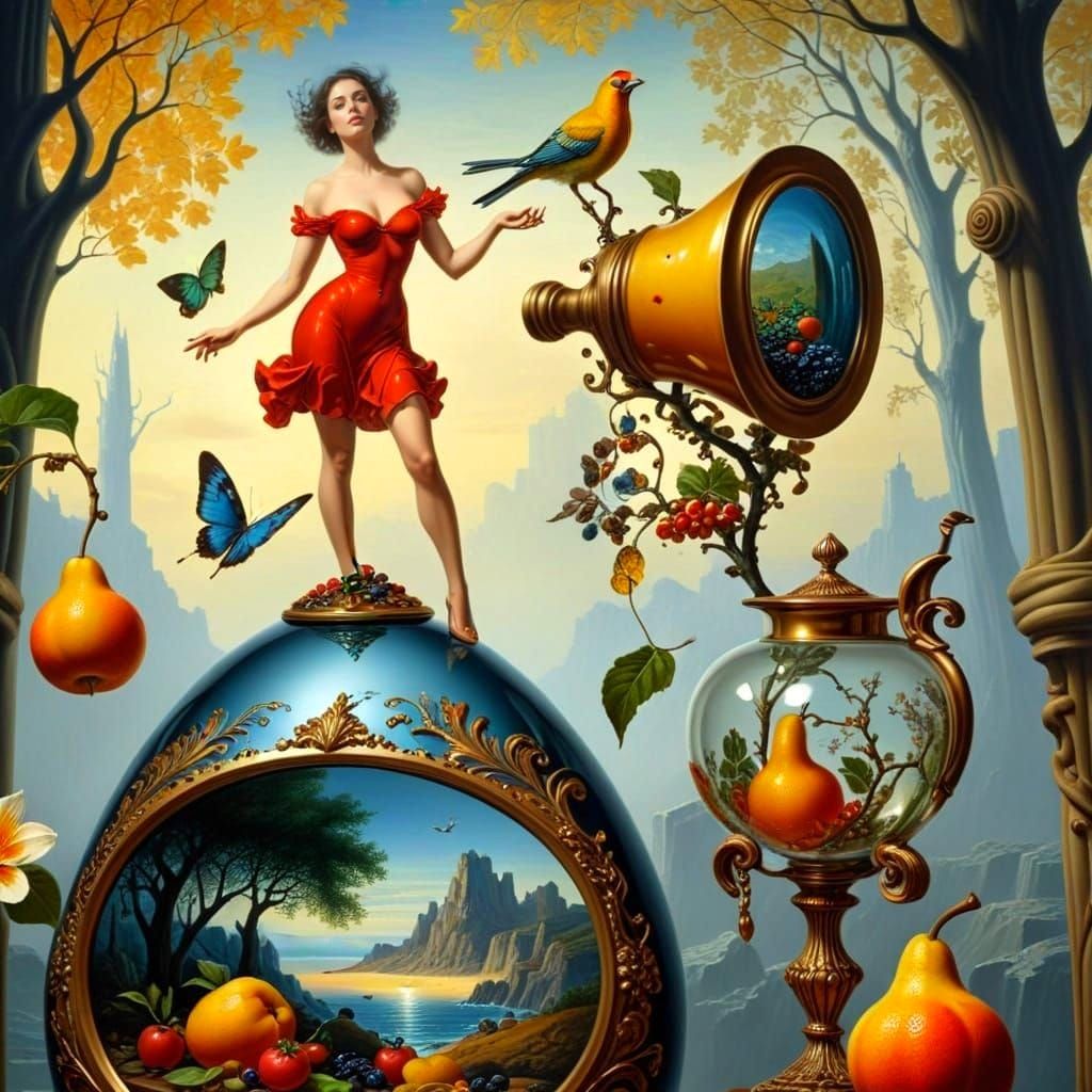 graceful female figures in fantastic surreal composition by Max Ernst, Rene Magritte, Salvador Dali, Johfra Bosschart, Evandro Schiavone, Paul Delvaux, Pablo Amaringo, Roger Dean, Patricia van Lubeck, Pieter Claesz, Clara Peeters, Jan Bruegel the Elder; hyperrealism, surrealism, eldritch, fantasy with ...