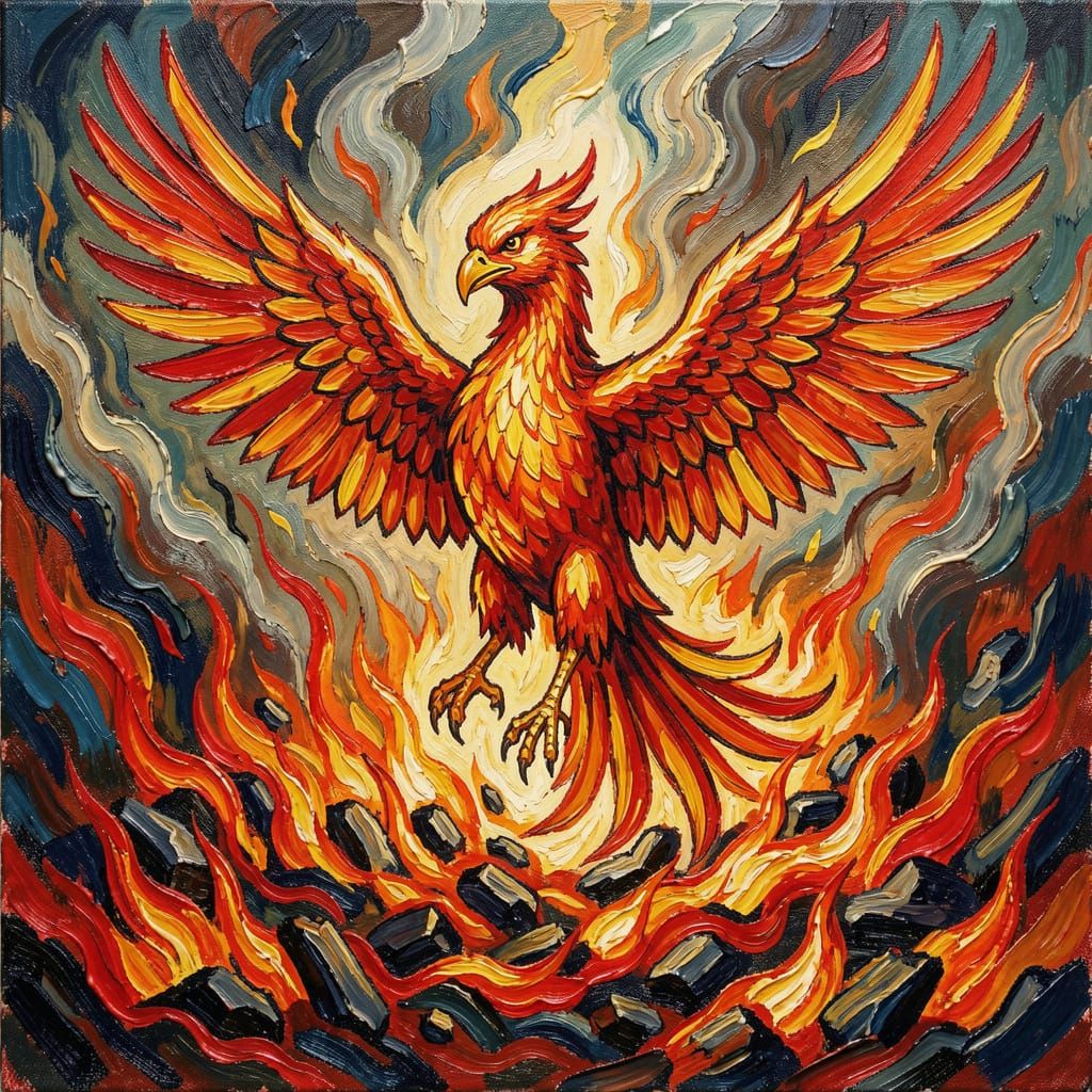 A majestic phoenix erupts from embers in a neo-impressionist style with bold brushstrokes and vivid colors. Thick impasto acrylic textures convey raw power and intense energy of rebirth.