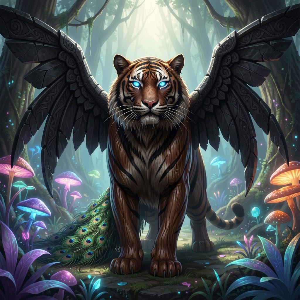This image shows a fantastical concept art piece of a wooden tiger with glowing blue eyes and a peacock tail, adorned with black stone wings in an alien forest with bioluminescent plants.