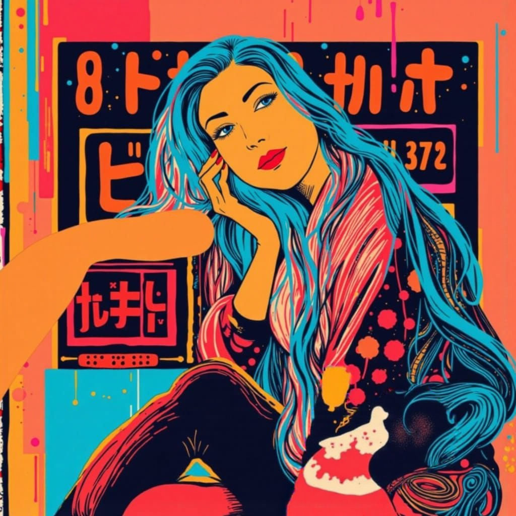 A vibrant, beautifully balanced piece where the colours, the rendering, and the overall harmony work together with real finesse. The composition feels both bold and fluid, with that pop‑art energy softened by a contemplative pose. It’s visually striking without ever losing coherence.