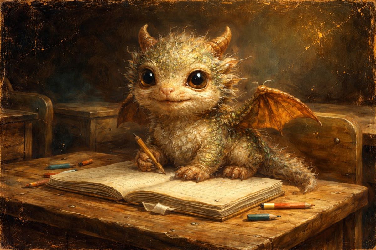 This image shows a tiny, fluffy baby dragon on a child's school desk, rendered in a highly detailed, realistic oil painting style with visible brushstrokes on an old canvas.