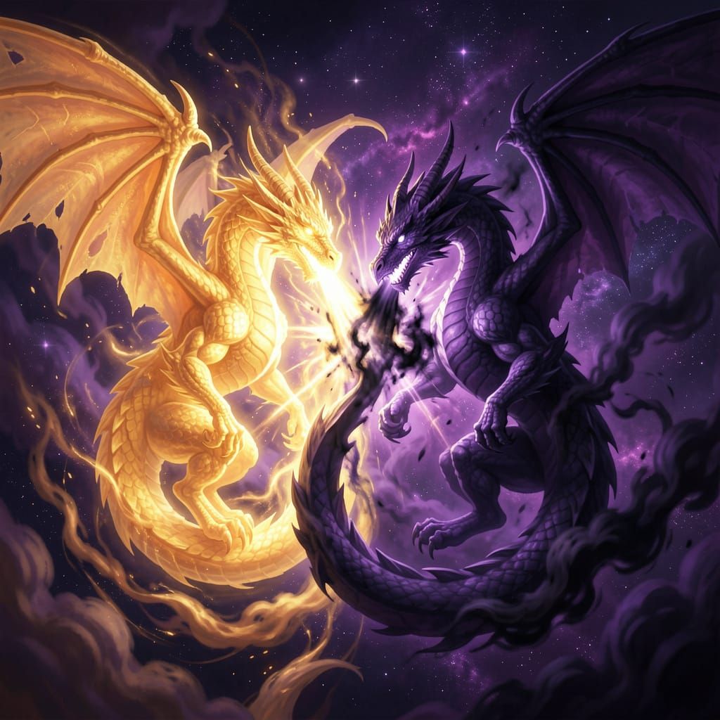 This image depicts a radiant light dragon and a shadowy dark dragon engaged in a fierce celestial battle. Their elemental breaths clash amidst swirling energy and ethereal textures, creating a dramatic cosmic fantasy illustration.