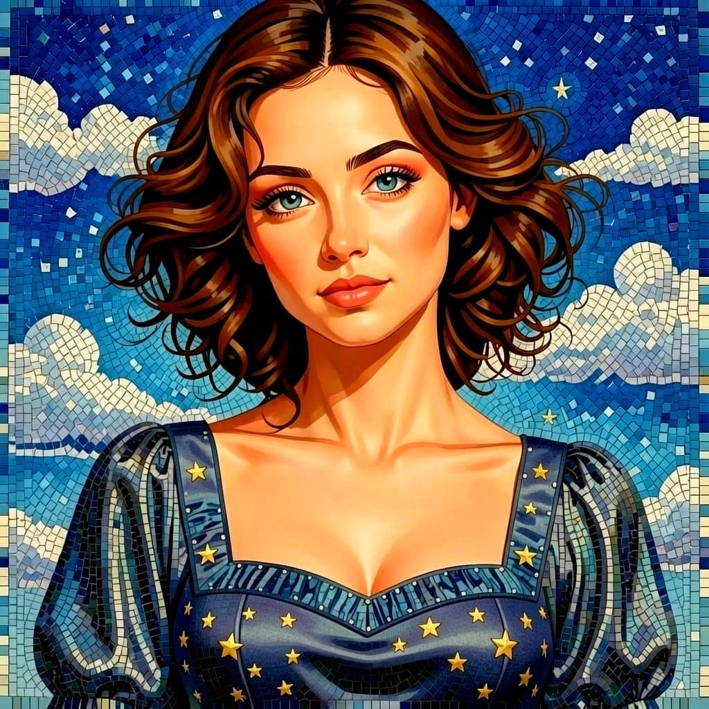 A beautiful woman with luminous blue eyes and soft chestnut-brown waves smiles gently as she draws delicate flowers in her hands. She wears a lovely blue short dress adorned with shimmering gold stars outlined in silver. Warm light caresses her face and flowing hair, creating an intimate and tender moment full of quiet joy.