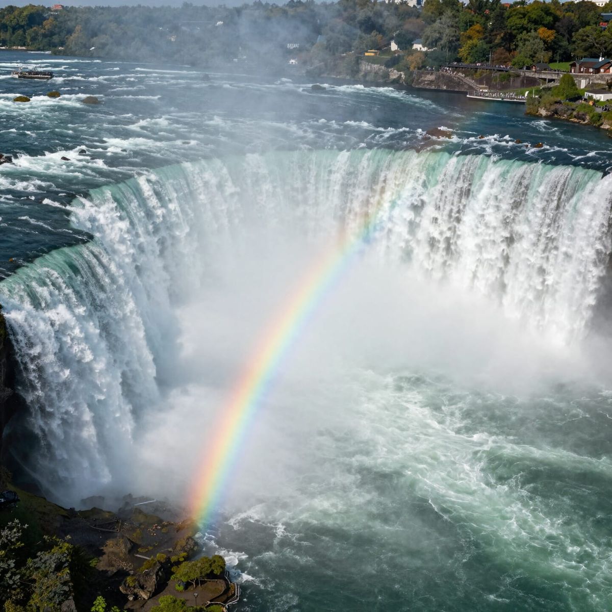 This image captures Niagara Falls from above, showcasing crashing water and a vibrant rainbow created by sunlight and mist. Photorealistic detail with dynamic lighting.
