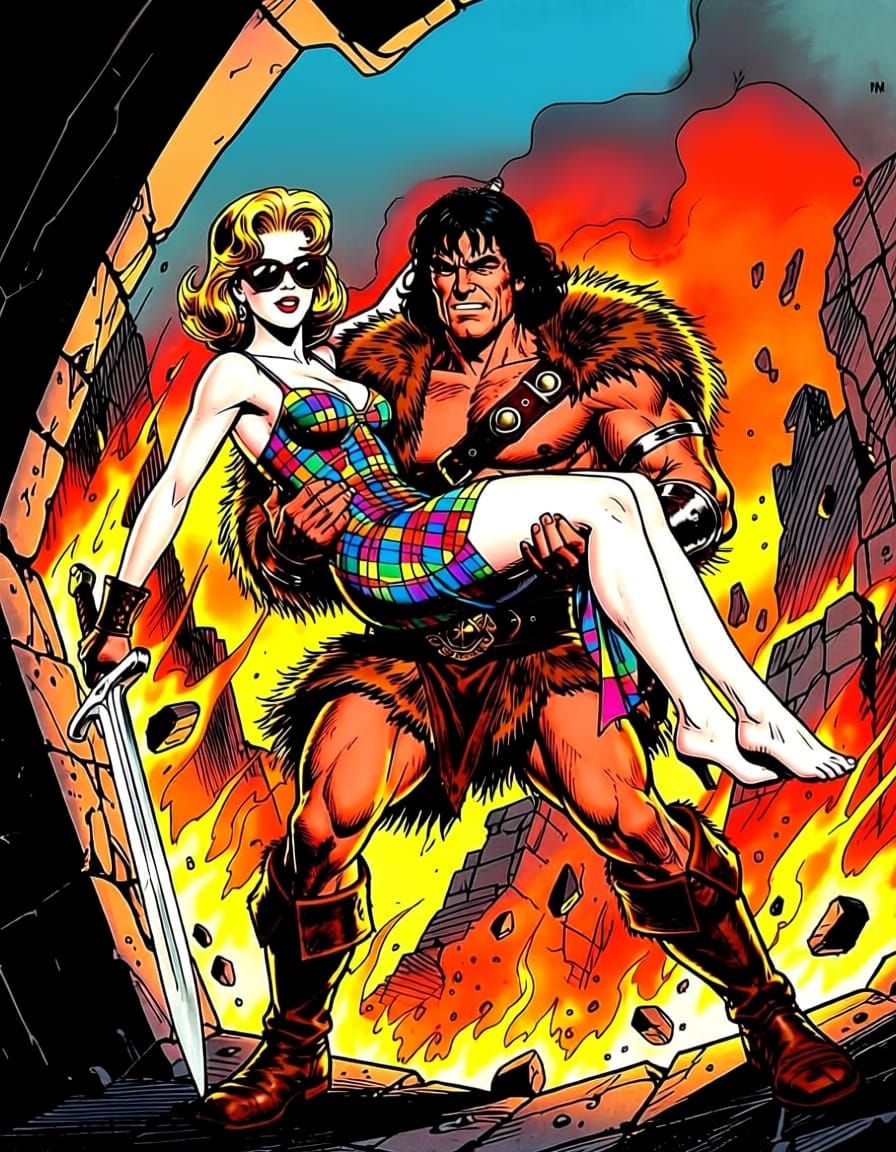This dynamic illustration captures Conan the Barbarian carrying a woman from a burning, collapsing tower. The scene emphasizes a rugged warrior aesthetic against apocalyptic chaos.