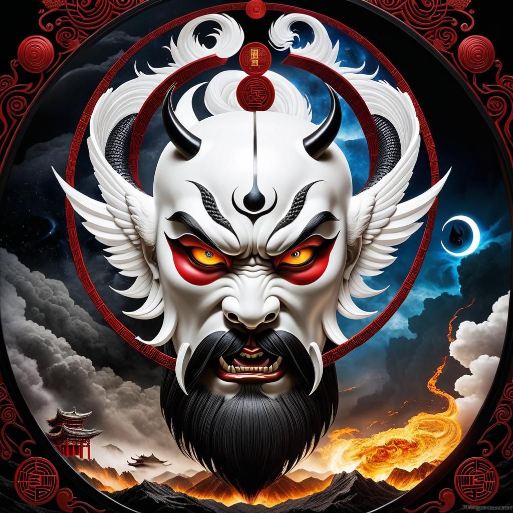 This image depicts the eternal struggle between good and evil, drawing inspiration from ancient yin yang philosophy and its balanced duality.