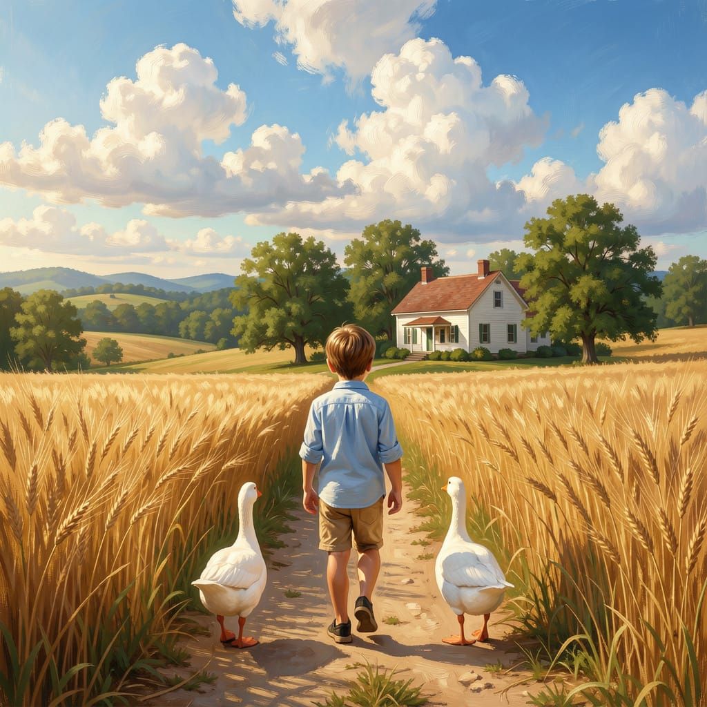 A hyperrealistic digital painting of a boy walking through a golden wheat field with geese. Features a farmhouse, rolling hills, and dramatic clouds in warm afternoon light.