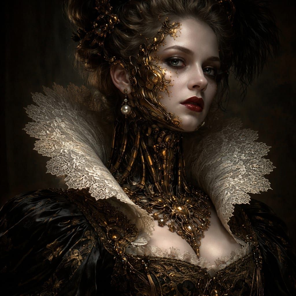 A highly detailed, painterly portrait of an elegant baroque noblewoman with ornate gilded facial mechanisms and brass implants. Her regal, haunting appearance is enhanced by dramatic chiaroscuro lighting.