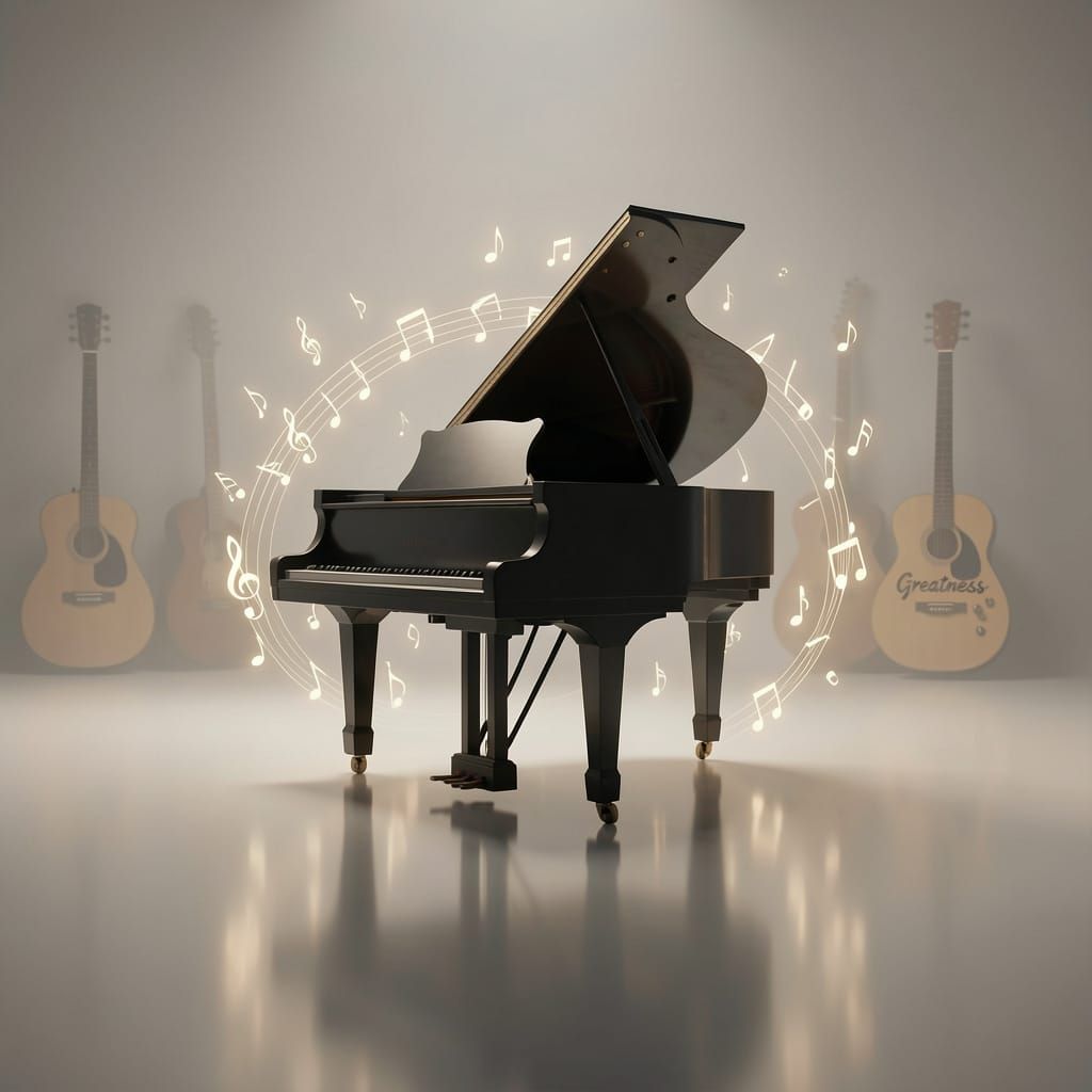 This image shows a grand piano on a reflective surface, with glowing musical notes and guitars in the background. Rendered with minimalist elegance and dramatic lighting, it evokes artistic achievement.