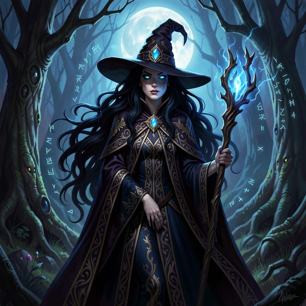 This image shows a powerful witch in a moonlit forest, holding a crackling staff. Rendered in a dark fantasy art style with dramatic lighting and vivid jewel tones.