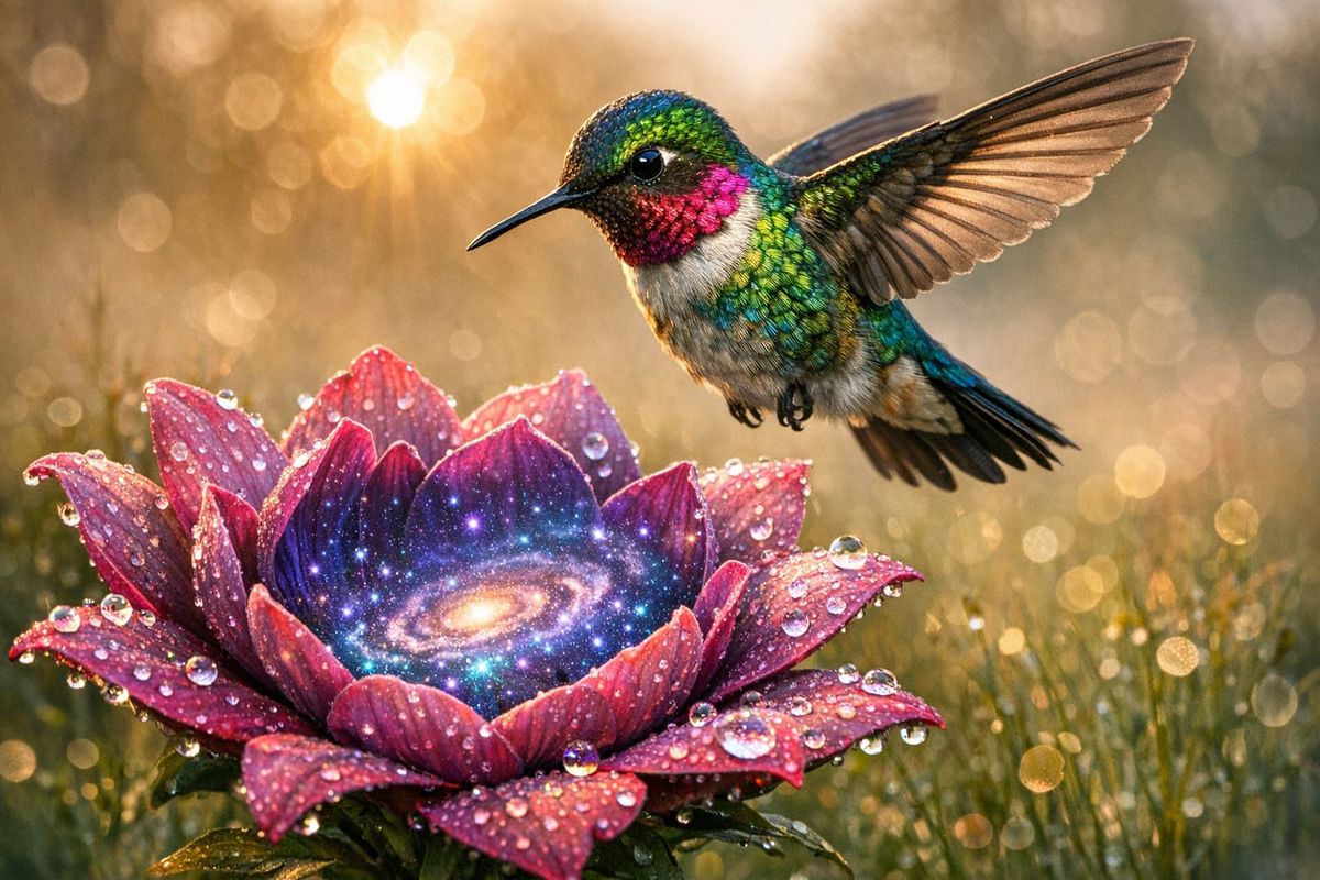 This ultra-detailed macro photo shows a regal hummingbird with iridescent feathers hovering over a fantastical flower. The flower's petals reveal a luminous galaxy, glowing with violet and cyan light. Soft dawn light and bokeh enhance the realism.