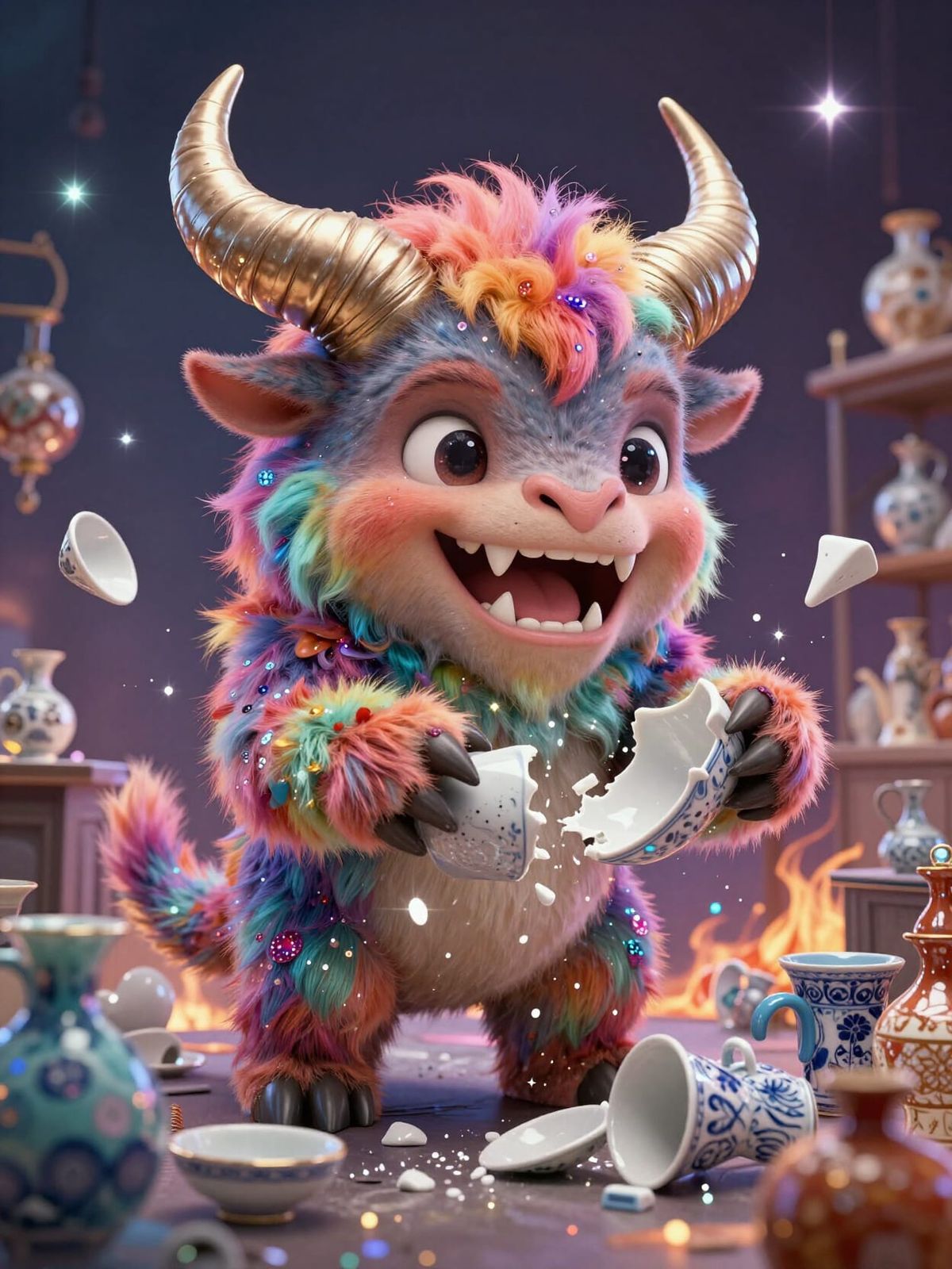 This image shows a cute, rainbow-furred Minotaur toddler with big teeth, smiling amidst a chaotic scene in a glass shop, with sparkles and glitter effects.