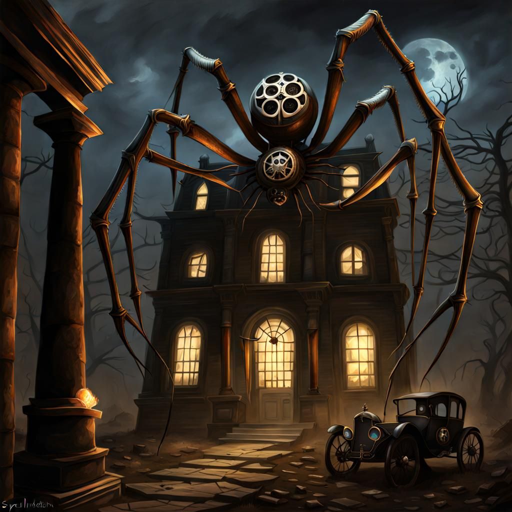 This image depicts a steampunk-inspired scene of haunted ruins. A mechanical spider lurks within, creating a horror aesthetic reminiscent of gothic art.