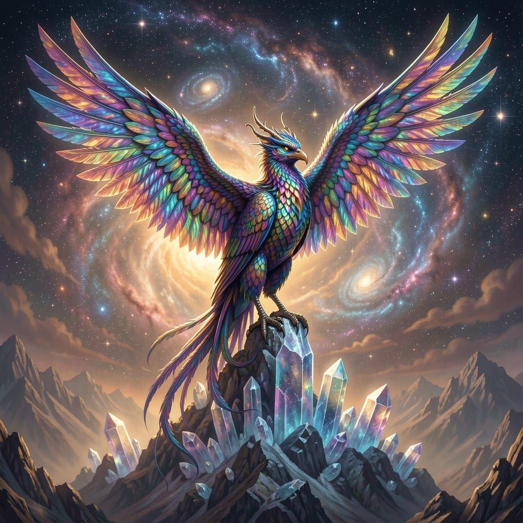 A hyperrealistic fantasy art piece shows a phoenix with shimmering, iridescent scales on a crystal mountain. Dramatic lighting highlights the epic scale against a cosmic sky.