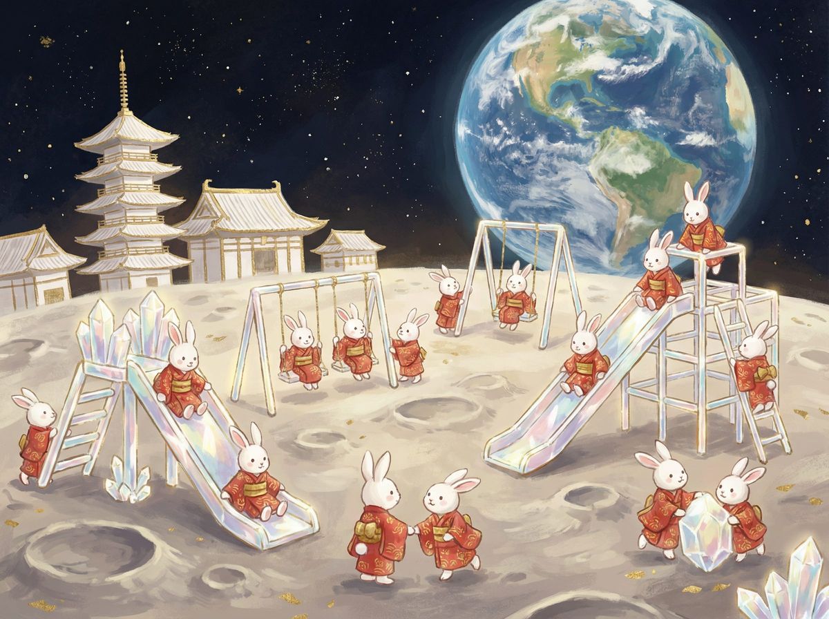 This digital painting features rabbits in red and gold kimonos playing on the moon. Whimsical pagodas and crystalline playground equipment fill the background, with Earth visible in the sky, rendered in a childlike Japanese painterly style.