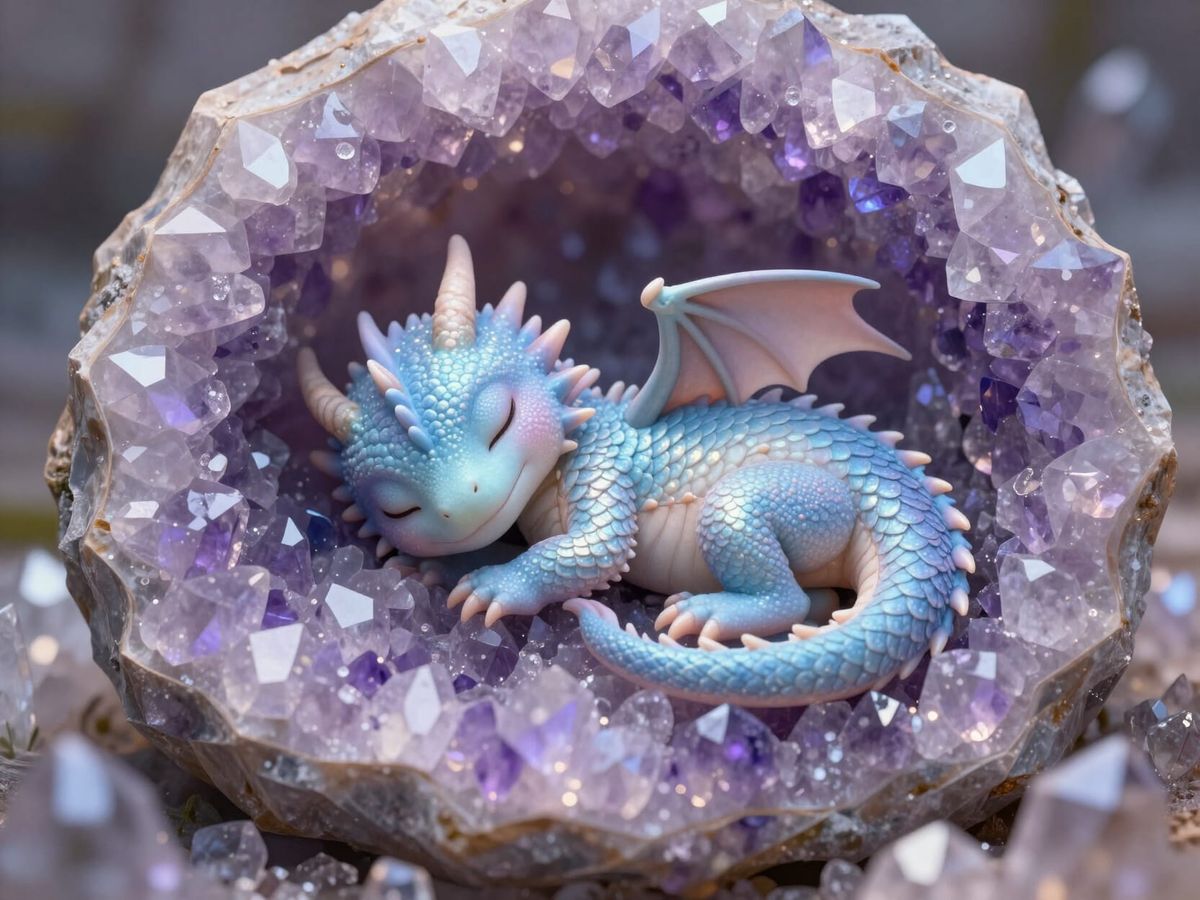 This image shows a tiny, fuzzy baby dragon sleeping peacefully within a large amethyst geode. Soft light creates an ethereal glow, highlighting its pearlescent blue scales and nascent wings.