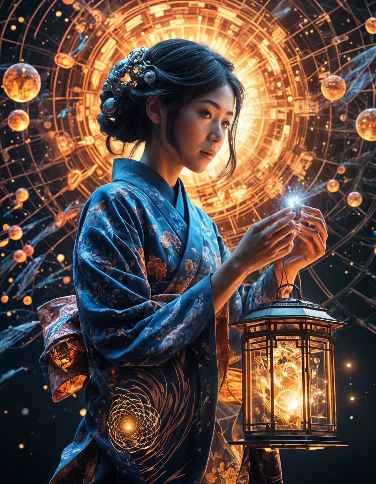 This image shows a woman in traditional Japanese attire holding a luminous firefly cage. A skeletal shadow is cast against a twilight backdrop, featuring geometric shapes and holographic effects.