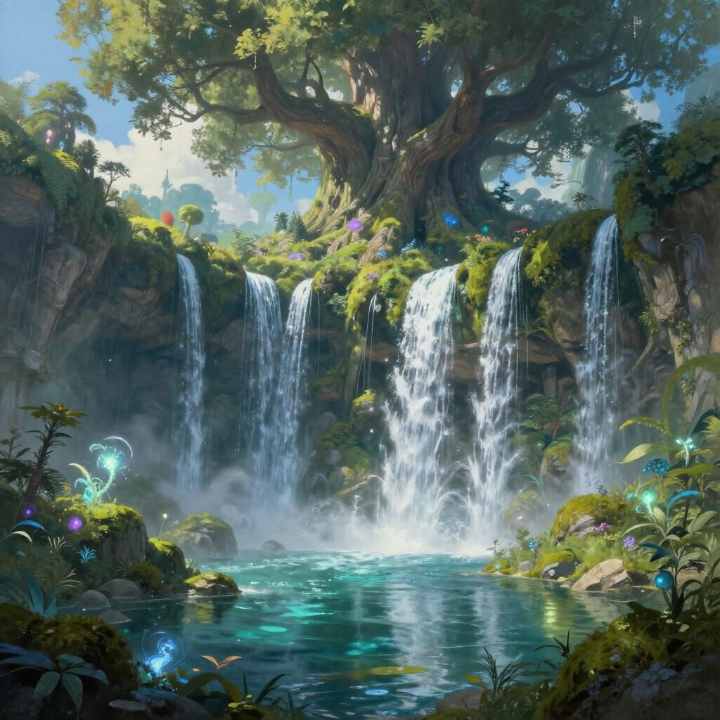 This concept art shows a hidden elven city within a giant ancient tree, with waterfalls flowing into a clear lake. Features luminous flora and fauna, in a painterly fantasy illustration style.
