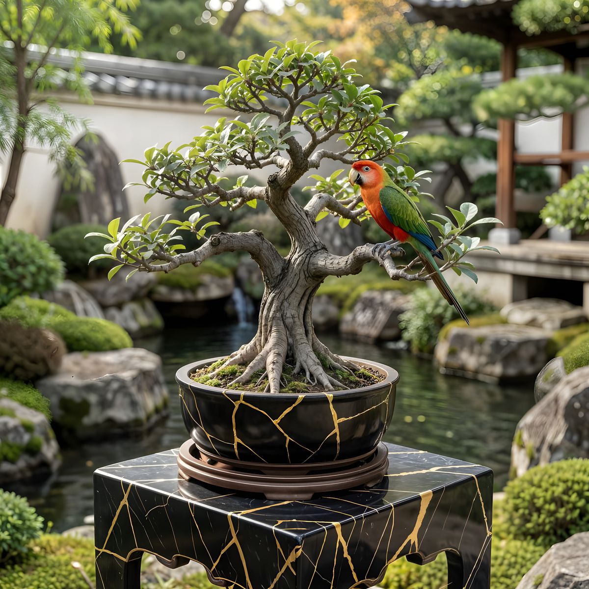 This image features a detailed, realistic depiction of a miniature parrot perched on a delicate bonsai tree. The bonsai is housed in a black Kintsugi-style ceramic pot, set on a black marble base with gold accents, within an intricate Japanese garden.