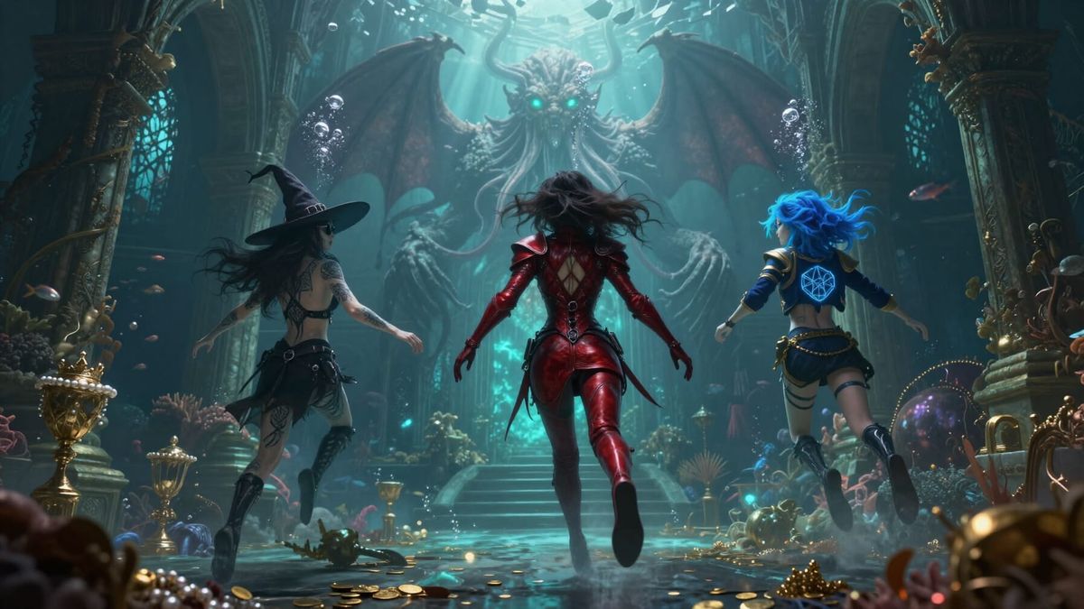 A hyper-detailed digital painting shows three figures swimming in a flooded throne room. Features cyberpunk and gothic fantasy elements with ethereal underwater lighting and intricate textures.