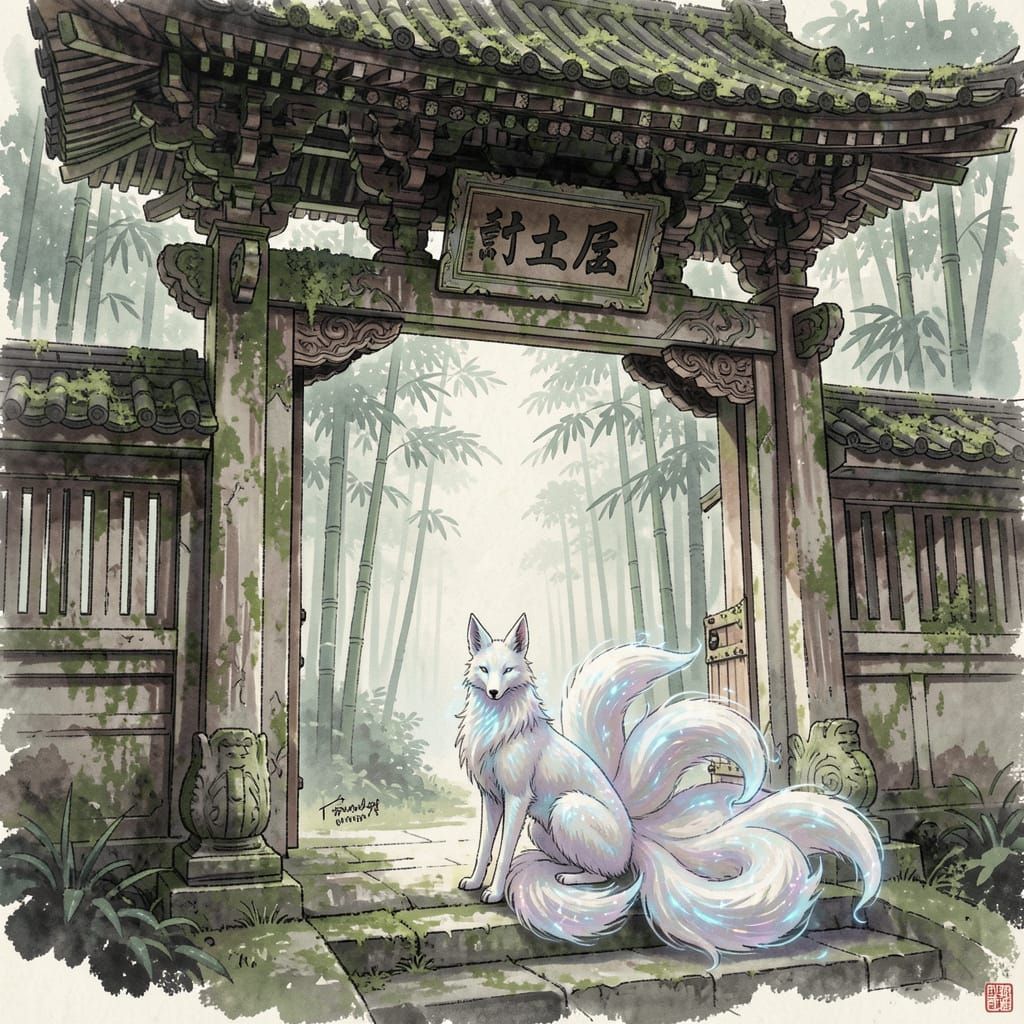 This image depicts a weathered, moss-covered Japanese temple gate opening to a misty bamboo forest. A mythical nine-tailed fox sits at the entrance, rendered in the style of ink wash painting with digital enhancements.