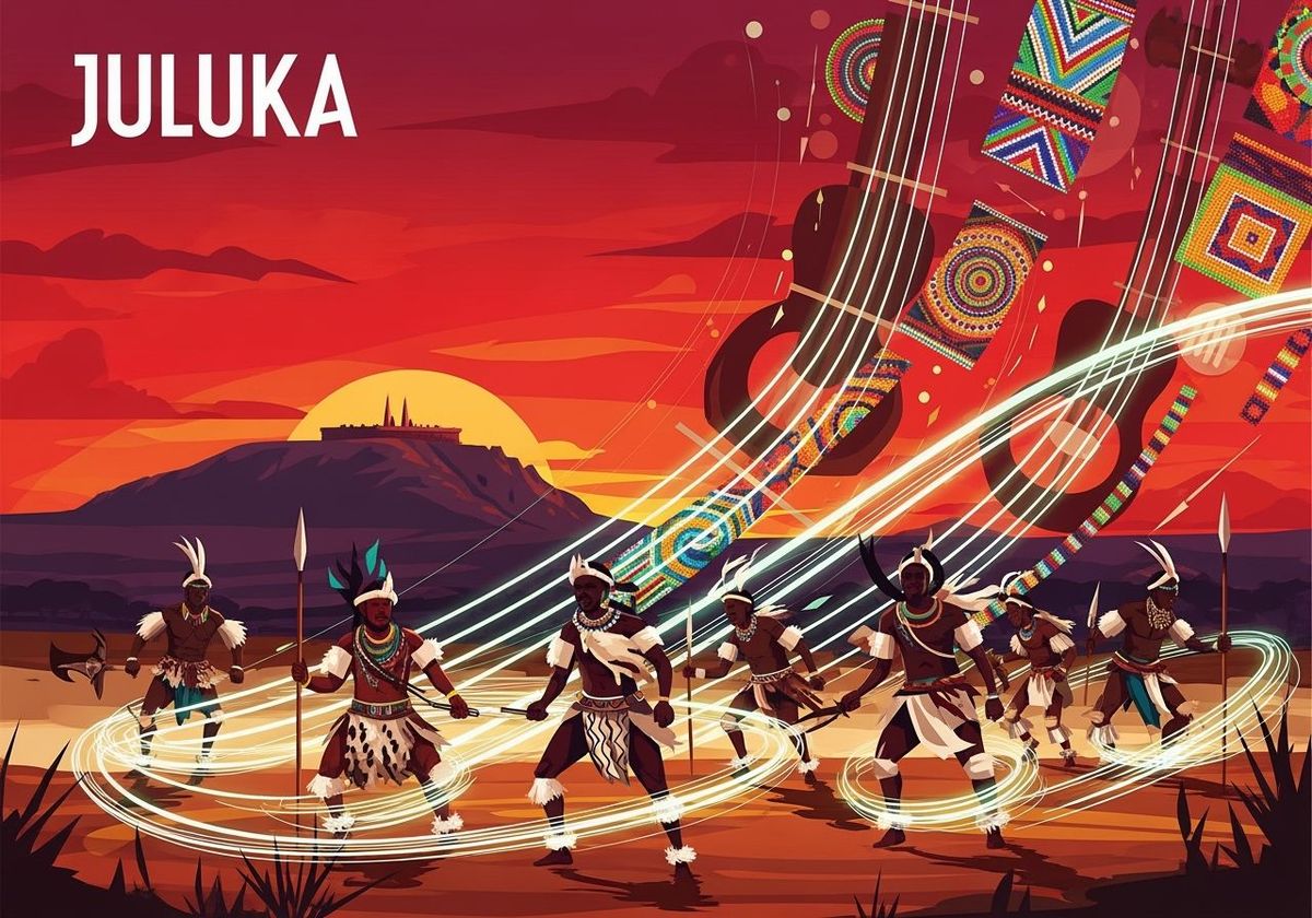 This image shows Zulu warriors in traditional attire, rendered with sharp lines and bold colors, dancing dynamically with glowing light trails. An Afro-futurist style with abstract Zulu beadwork patterns in the sky.
