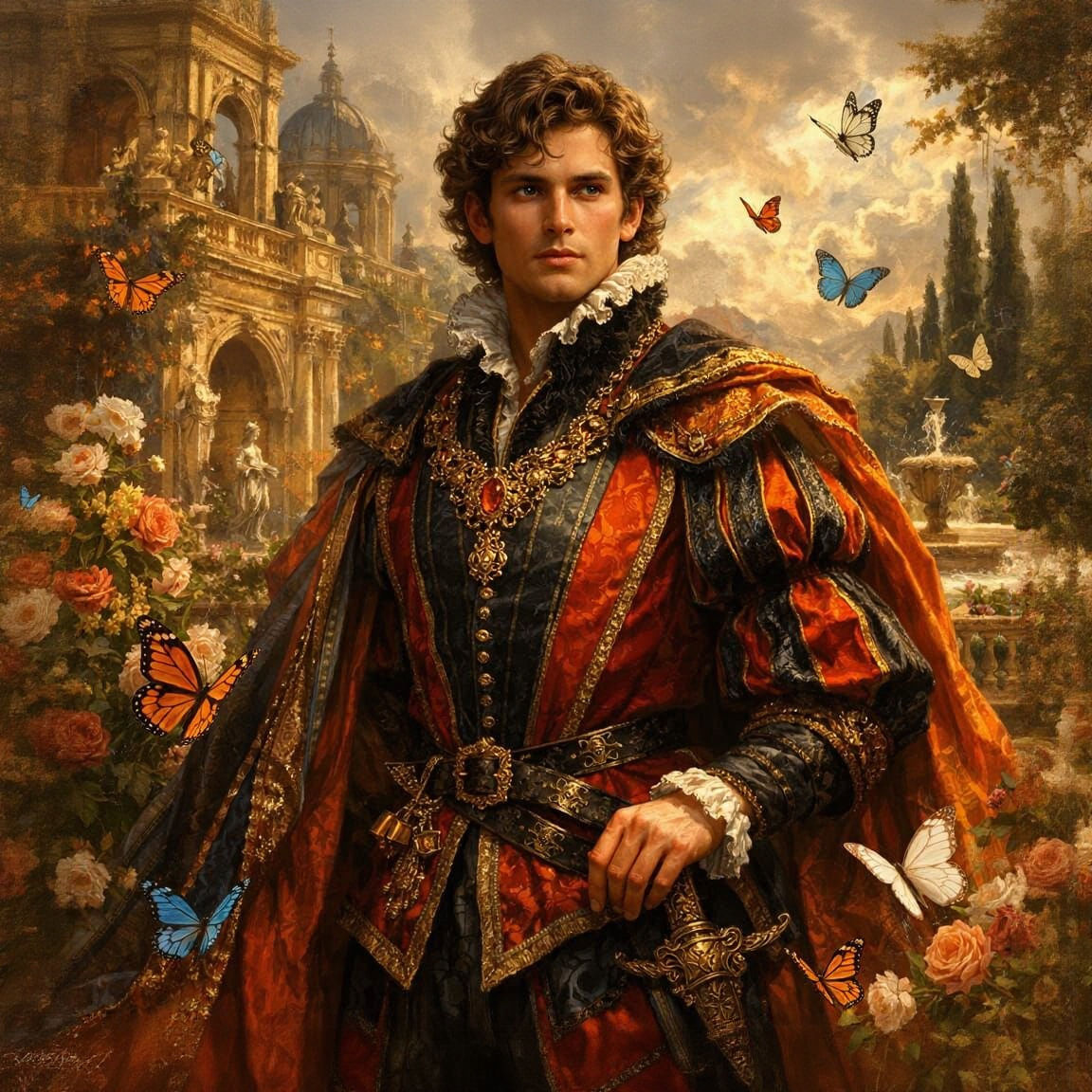 A dramatic digital painting of a man in ornate Renaissance clothing amidst a sunlit palace garden filled with butterflies. The artwork features intricate details and atmospheric lighting.