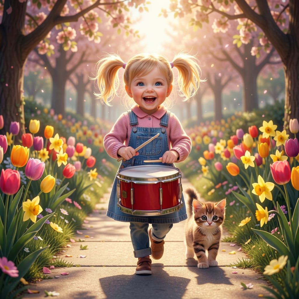 This image shows a triumphant girl playing a red drum, followed by a kitten. Spring flowers bloom, rendered in a stunning, detailed digital matte painting style with vibrant colors.