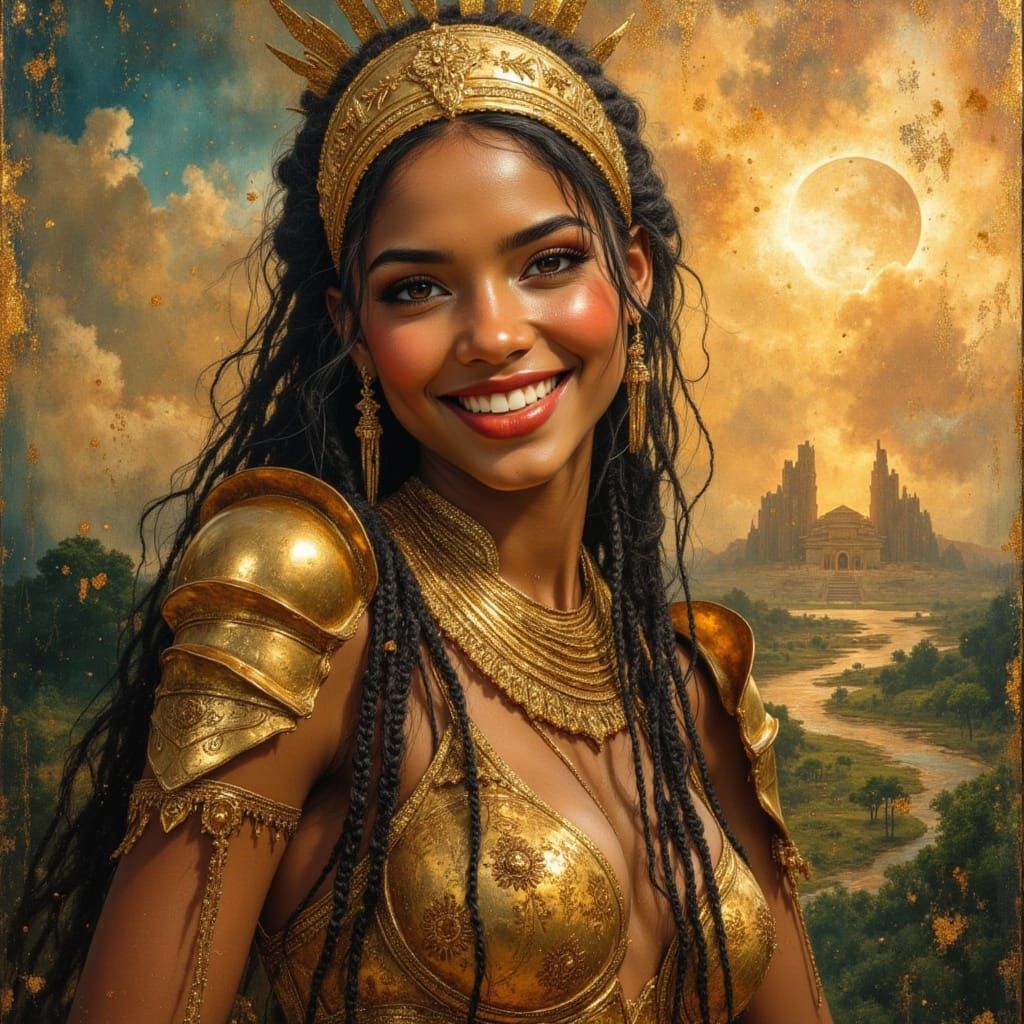 This image features a beautiful Nubian warrior goddess with sun-kissed skin and braided hair, adorned in golden armor. She overlooks an alien jungle beneath twin moons, rendered in a divine oil painting style.