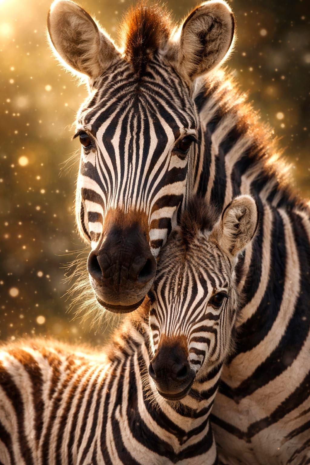 This hyper-detailed digital artwork showcases a realistic close-up of a zebra mother and her young, with individual hairs textured. The image features magical sparkles and light.