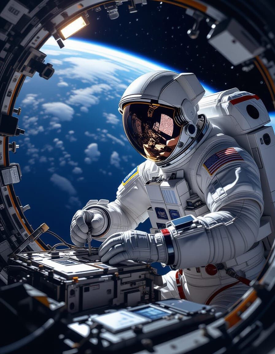 This photorealistic digital painting shows a focused astronaut fixing complex gear near the ISS, with Earth below. Dramatic lighting highlights intricate details.
