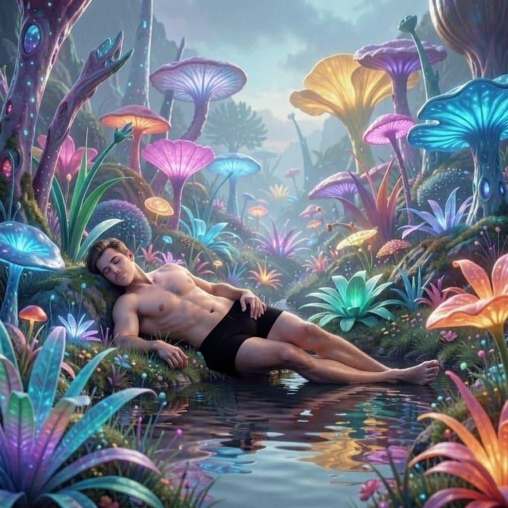 Easily generate unique images of men in loincloths resting by alien ponds. Try it free!