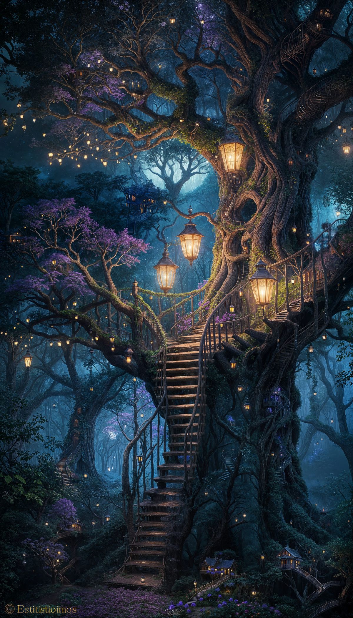 Digital painting. A whimsical treehouse nestled in the boughs of an ancient, glowing tree, with winding staircases and lanterns illuminating the night. Soft, ethereal lighting, deep blues and purples. Enchanting fantasy art, children's book illustration, intricate details, volumetric lighting, mystical ...