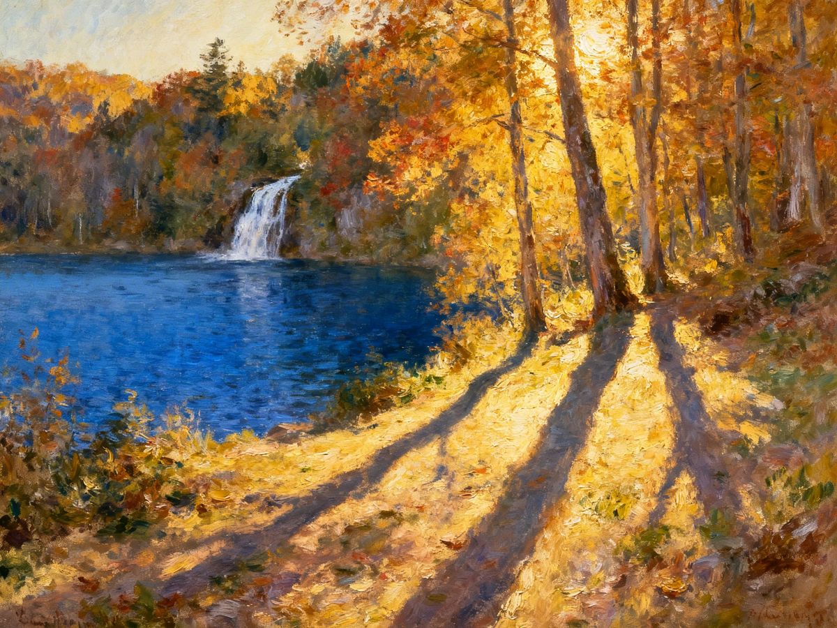 This image shows a small waterfall flowing into a deep blue lake amid an autumn forest. Bathed in golden hour light, it features dramatic shadows and a painterly, impressionistic quality with soft brushstrokes.