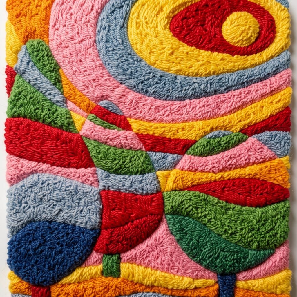 This image showcases an ultra-detailed punch needle embroidery of an abstract modern landscape. It features rolling hills, geometric composition, and a circular sun, rendered with a vibrant, tactile textile relief.