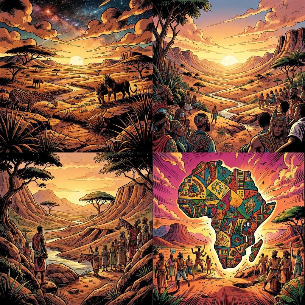 This AI-generated comic art depicts a rich African landscape, evoking themes of resilience and depth through atmospheric elements and cultural expression.