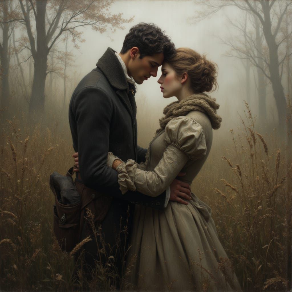 This image shows two lovers from different social classes meeting secretly on a foggy moor, rendered in a brushed oil painting style reminiscent of 1840s Victorian art.