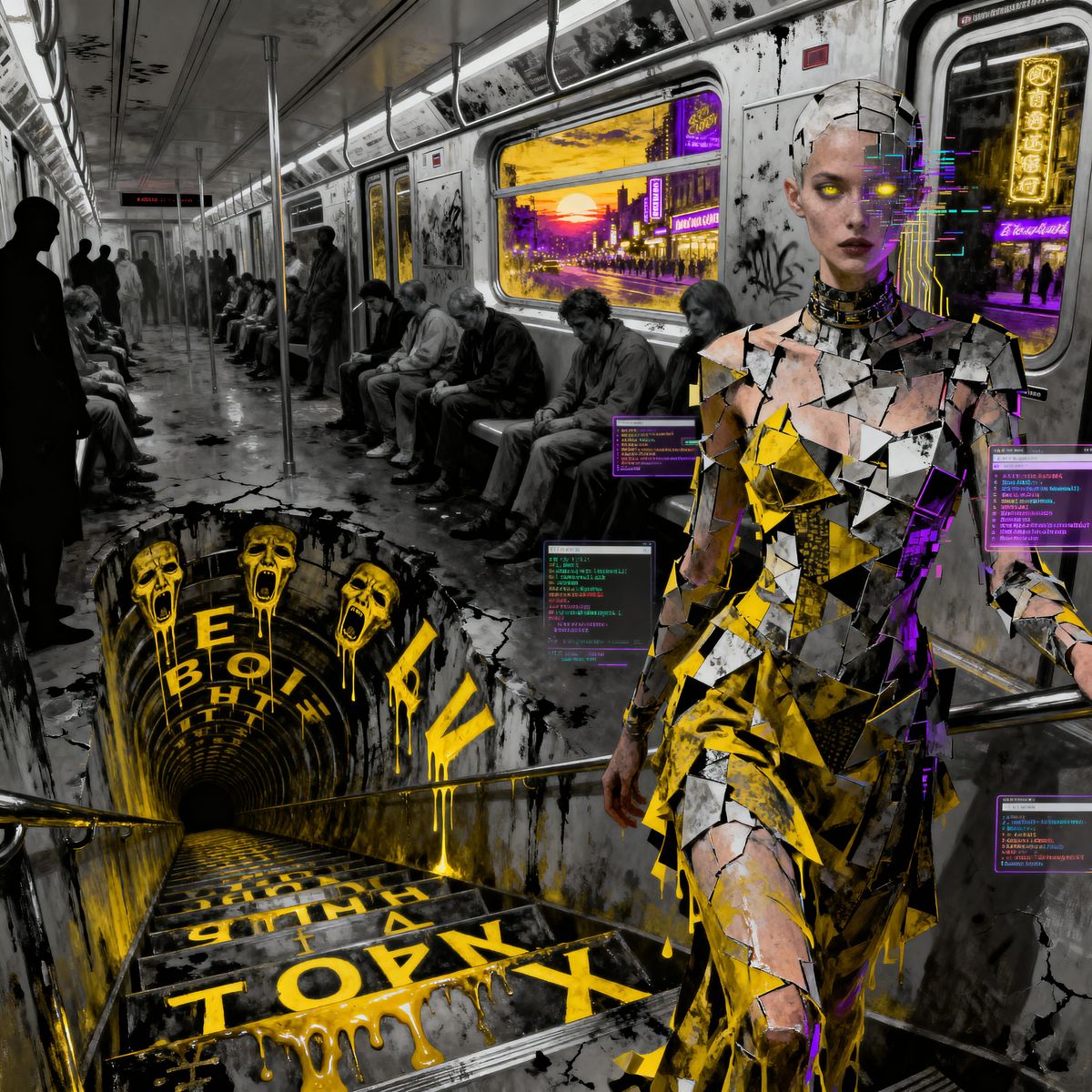 This AI-generated image depicts a schizophrenic vision within a subway car. Liquid words cascade down a warped staircase, morphing into faces and symbols, set against a monochrome palette.