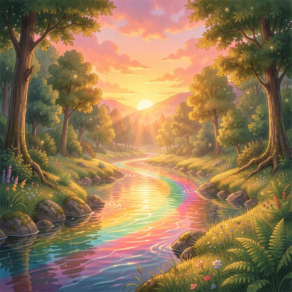 This image features a vibrant rainbow river flowing through a lush forest during a dramatic sunset. The scene is rendered in a magical realism style with ethereal beauty and soft, glowing light.