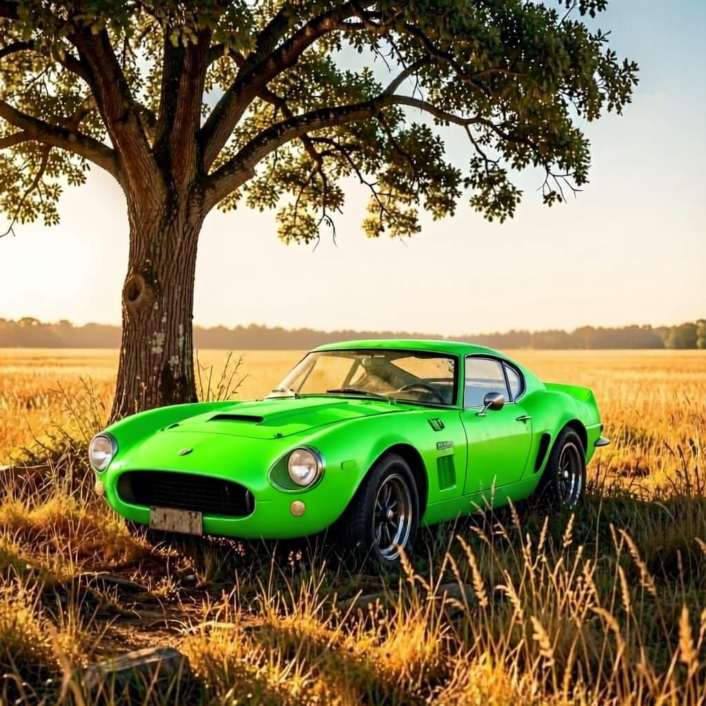 This hyperrealistic image shows a vintage sports car left abandoned beneath a solitary tree in a field. It features intricate details and a colorful background with dramatic lighting.