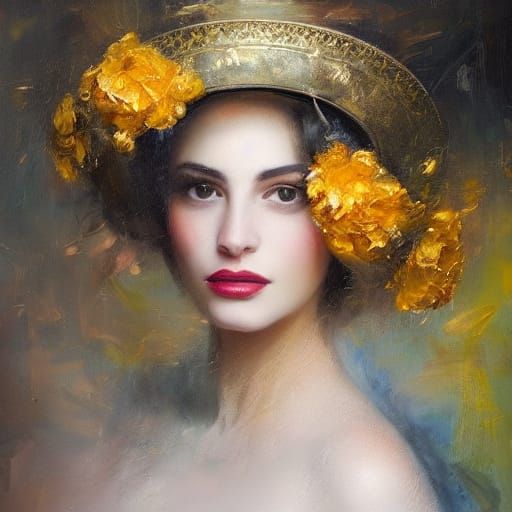 This fine art oil painting features a woman wearing an ornate golden hat adorned with fabric flowers. The artwork uses expressive brushstrokes and dramatic lighting to create a moody, evocative atmosphere with rich texture.