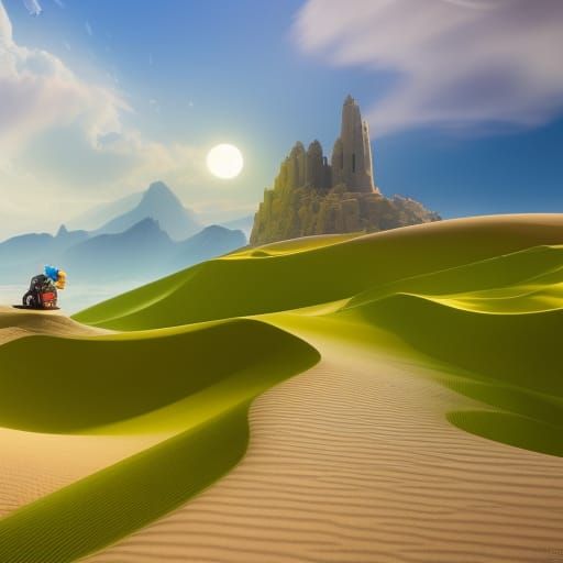 This image shows a surreal castle in a desert landscape under a bright moon. Distant ruins and palm trees dot the dunes, illuminated by glowing light in a whimsical digital illustration.