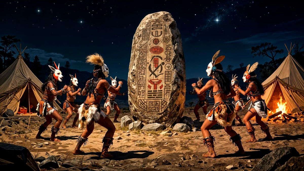This image shows primitive humans in shamanic masks performing a synchronized ritual dance around a petroglyph-covered stone under a starry sky, in a dark fantasy concept art style.