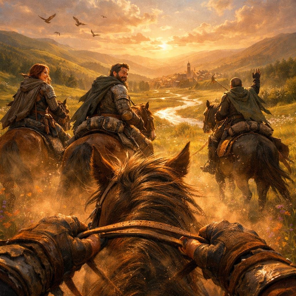 This image captures a first-person view of an adventurer returning home on horseback through a vibrant, sun-drenched valley. Companions ride ahead as warm light illuminates the dusty path and rolling hills.