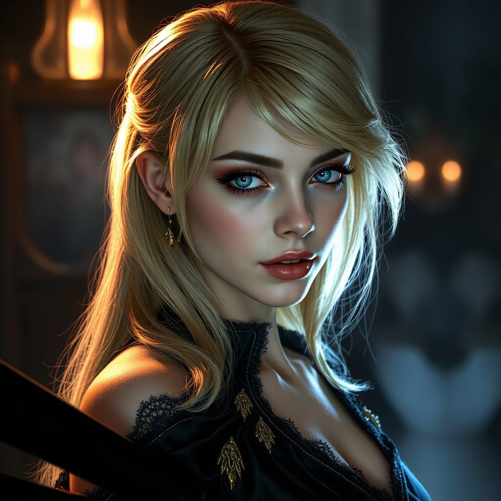 This image depicts a stunning female vampire with blonde hair and piercing blue eyes, set against a dark backdrop illuminated by a soft spotlight. The artwork is reminiscent of a mystical, ethereal quality, with intricate details and a dreamlike atmosphere.