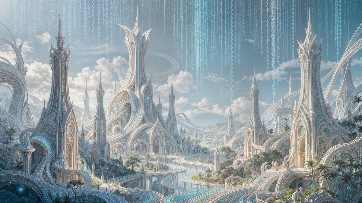 32k concept art of a pastel iridescent high-elven village, intricately detailed and a masterpiece. The architecture is made entirely out of flowing lines of shimmering binary code and abstract data streams, resembling pastel iridescent 0s and 1s. This is a fusion of The Matrix and Lord of the Rings aesthetics, ...