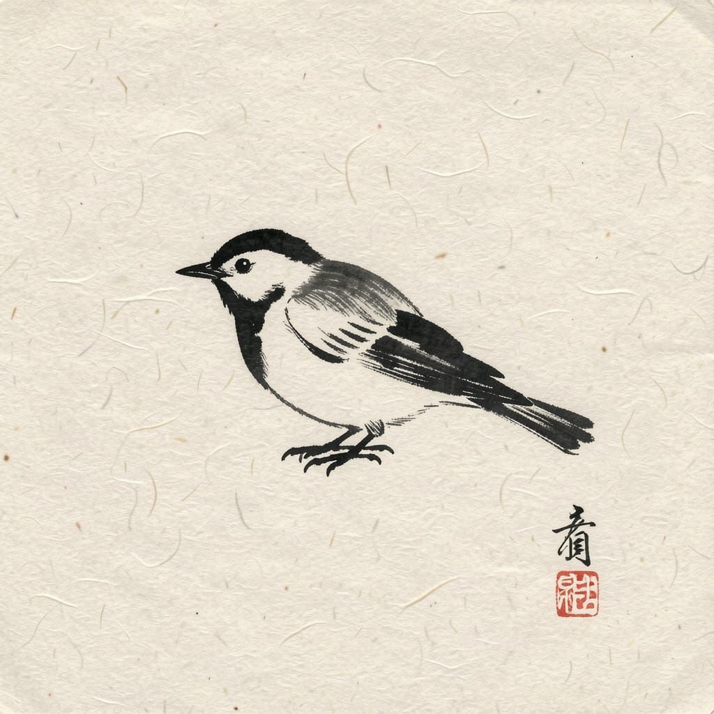 This image showcases a single bird created with three masterful ink strokes on textured washi paper, embodying profound simplicity and emotional depth in a Zenga aesthetic.